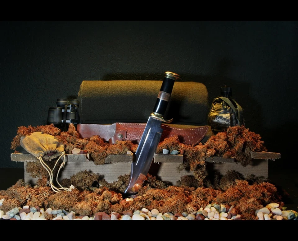 The **Hunter Bowie Knife** is a high-quality, handcrafted outdoor blade designed for performance and durability. Built with a **razor-sharp 13-inch stainless steel blade** and **brass guard**, it offers superior cutting power and control. The handle combines **stacked leather and polished wood** for a secure, comfortable grip. Included is a **premium leather sheath with belt loop**, ensuring safe storage and easy carrying on your next adventure.